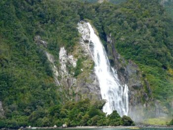 A peine le bateau a-t-il quitté le port, on fait un passage devant la cascade de Lady Bowen, – en l’honneur de l’épouse d’un des premiers gouverneurs de la Nouvelle-Zélande- , la plus haute des deux cascades permanentes du Milford Sound. Elle tombe de 161 mètres depuis une vallée suspendue de la chaîne de Darren. La base des chutes ressemblent à des tombes. Et l’on remarque trois vraies tombes qui datent de l’époque des chasseurs de baleines et de phoques. A proximité, on observe le ravin de Sinbad, délimité par les pentes abruptes du mont Philipps (1445 mètres). Immanquable, on a en vue le Mitre Peak (1692 mètres – son nom vient de sa forme qui ressemble à la mitre d’un évêque) qui est une des plus hautes montagnes du monde à s’élever ainsi directement du fond de l’océan. Plus loin, on distingue le mont Kimberley – nommée montagne du Lion – en raison de son allure de lion couché.