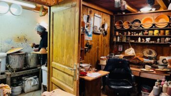 Il ne vous attend pas, il est juste là dans son antre, dans sa boutique-atelier, à la décoration bien personnelle qui ne cherche pas à séduire le passant. Son accoutrement de potier, non plus ne cherche pas « « à faire du genre », c’est juste sa tenue confortable et son grand tablier qui ne craint pas les taches. Ne cherchez pas le nom de son coiffeur non plus. Gégé le potier, Gérard, il est là pour vivre sa poterie.