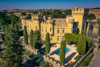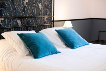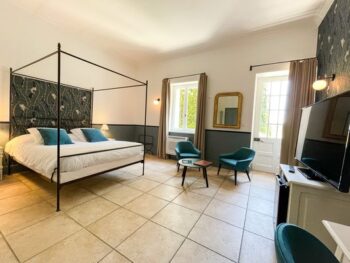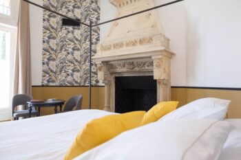Certaines chambres donnent plein sud sur les Alpilles et le Palais des Papes à Avignon, d’autres, côté piscine, sur le Lubéron, et d’autres encore sur le Mont Ventoux. L’âme du lieu est respectée avec une belle bouffée de modernité. La décoratrice d’intérieur, Alison Lanceleur a employé les couleurs contemporaines. On note la présence de nombreux tableaux mêlant géométrie et colorimétrie primaire, un mobilier aux formes vintage tout en conservant quasiment tous les sols. Côté couleur des murs, l’équipe a opté pour un bleu nuit de chez Chromatic en accord avec l’identité visuelle du lieu, qui n’est pas sans rappeler ce bleu profond des raisins de Châteauneuf-du-Pape. La chambre logée dans l’une des tours du château bénéficie d’une terrasse privée et d’un roof top ! Dans la totalité de l’établissement, la décoration offre une palette ensoleillée avec un jaune astral et un vert nature pour les parties communes. Quant à la salle de restaurant, elle est entrée dans une nouvelle dimension avec une plus grande luminosité, un mobilier beige, des murs clairs et un nappage blanc épuré.