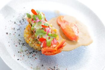 Lors des beaux jours, on prend son dîner sur la terrasse extérieure avec vue sur les vignes et à l’horizon sur le Palais des Papes d’Avignon. C’est un moment prisé. Ici, on a le sens d’un service haut de gamme tout en conservant la convivialité. Le Chef Hugo Loridan-Fombonne se donne les moyens tranquillement d’aller chercher une étoile. Il a grandi en Camargue, bercé par les spécialités culinaires de sa grand-mère. Elevé “à la gardiane de taureau et à la soupe de poissons”, Hugo vit un attachement viscéral au Château des Fines Roches où il a pris son premier poste en 2012. A 30 ans, ce jeune Chef a la conscience écologique développée. Il aime travailler le mono produit pour le sublimer et respecter le travail des producteurs. Le végétal est pour lui très important car la région est riche en produits. Il est aussi très respectueux de la saisonnalité et pas seulement pour les fruits et légumes mais aussi pour les crustacés, les viandes et les poissons. On se régale avec son Menu Inspiration, servi à l’aveugle.