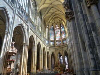 Dans l’enceinte de ce dernier se situe une ruelle très célèbre, la ruelle d’Or. Elle doit son nom aux orfèvres qui y vécurent au XVIIe siècle. Mais sa renommée, elle la doit également aux nombreux artistes et écrivains, dont le plus connu est Kafka. Ils s’installèrent dans les petites maisons peintes de couleurs vives. Enchâssé dans la vaste cour du château, on trouve la Cathédrale Saint-Guy, un monument caractéristique de Prague, et un ensemble de bâtiments somptueux : l’ancien palais royal et la basilique Saint-Georges. Non loin, sur le haut de la colline se dresse le Monastère et la bibliothèque de Strahov fondé par l’ordre des Prémontrés en 1140. La bibliothèque renferme pas moins de 500.000 livres comportant des manuscrits du 10 ème siècle.