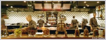 Le Chef de cuisine, Christophe Cussac, deux étoiles au guide Michelin, orchestre la musique aux fourneaux rouge et noir qui ressemblent à “L’Atelier”. On aime le concept original de la cuisine inventive et moderne, dans les teintes méditerranéennes du chef Cussac. Cet ancien élève de Robuchon a fait ses preuves dans de brillantes maisons. Dans un premier temps dans l’hôtel familial des Cussac en Bourgogne, chez Troisgros puis à la Réserve à Beaulieu où il a été chef des cuisines presque dix ans avec deux macarons déjà. Christophe Cussac réussit, confie-t-il à mettre en scène “Une cuisine française simple, conviviale avec des touches méditerranéennes”. Et, il poursuit “La simplicité n’est pas le plus facile à obtenir ; à un produit correspond un assaisonnement qui le valorise”. Il personnalise sa carte avec les produits locaux. “La cuisine ouverte permet des contacts privilégiés avec les convives”. Joël Robuchon, qui inspire cette cuisine, vient parfois à Monaco rectifier une saveur ou une épice mais il dort tranquille avec son talentueux chef et sa brigade aux commandes.
