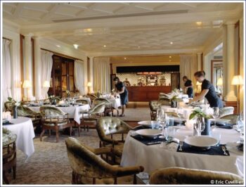 Assis dans de moelleux fauteuils, on profite de la salle de restaurant qui se singularise par ses tons clairs et beige. On s’y sent immédiatement à l’aise, mieux décontracté. Une ambiance conviviale règne donc sur le restaurant où l’on retrouve le style Jacques Garcia avec une toile de fond représentant une scène de Paul et Virginie (manufacture des Gobelins sous l’Empire), des fauteuils tapissés de velours et un parquet en bois exotique… Côté serveurs, les élégants uniformes ont été dessinés exclusivement pour le restaurant par Maud Lesur, la styliste de l’Hôtel Métropole qui contribue également à la décoration éphémère des arts de la table et de l’art floral.