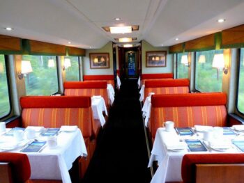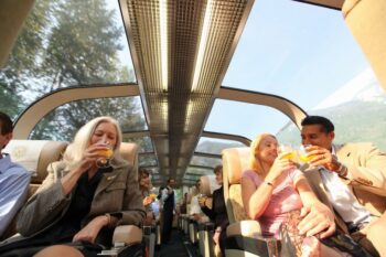 Les voyageurs ayant choisi l’option GoldLeaf à bord du Rocky Mountaineer reçoivent un accueil des plus protocolaires, avec tapis rouge au sol et drapeaux de la province et du pays. Notre voiture Gold Leaf, au service haut de gamme possède un étage. Au premier, les sièges sont alignés comme dans un train conventionnel, mais les murs et les plafonds sont presque entièrement vitrés. Une petite boutique, les cuisines et une belle salle à manger sont au niveau inférieur. Comme à bord de nombreux autres trains de luxe dans le monde, la voiture est équipée d’une plateforme couverte bien agréable d’où l’on peut prendre l’air, sentir le vent sur son visage, entendre le bruit des roues des wagons roulant parfois à vive allure sur les rails… et surtout rester en contact direct avec la nature et bavarder avec les autres passagers…. C’est à cet endroit que l’on prend les plus belles photographies. D’autres voyageurs choisissent la classe SilverLeaf ou la RedLeaf, qui sont plus économiques mais offrant des fenêtres panoramiques pour admirer le paysage, (les repas sont servis à la place).