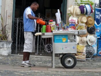 Un peu plus haut, l’ancien couvent de Santa Tereza abrite le Musée d’Art Sacré constitué autour d’une belle chapelle, d’un jardin verdoyant avec une splendide vue sur la baie. Une réelle oasis de paix située au cœur du bouillonnant centre de la ville. Si l’on poursuit son chemin, en montant encore davantage, on retrouve la ville haute et la Place Castro Alves et la statue du célèbre poète (connu comme le poète des esclaves). Chaque visiteur qui emprunte l’Avenue “Sete de Setembro”, la plus importante artère commerciale de Salvador (en souvenir de l’indépendence du Brésil) rencontre l’église de São Bento. On croise des vendeurs ambulants et leurs “voitures à café” disposant d’une dizaine de thermos, pour tous les goûts.