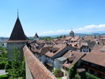 A 25 km de Fribourg, Morat enchante par sa situation idyllique au bord du lac du même nom. Depuis le Moyen Âge, la ville se blottit derrière ses remparts protecteurs. Fondée par les Zähringen… on se souvient de la bataille de Morat, le 22 juin 1476. C’est là que les Confédérés ont vaincu l’armée du duc de Bourgogne. Charles le Téméraire a ici perdu son légendaire courage. Au pied du château, on observe le lac aux couleurs tantôt bleu, tantôt vert… et au loin on aperçoit le vignoble du Mont Vully. Vingt cépages différents sont cultivés sur les coteaux de cette riviera fribourgeoise dont le Chasselas et le Pinot noir en tête. Ici, les restaurants déploient leurs terrasses dans une ambiance méditerranéenne au bord du lac ; on s’attarde volontiers dans les ruelles pittoresques et près des fontaines de pierre qui bordent les maisons. Les remparts et les arcades de la Grand-Rue sont une invitation à une flânerie, hors du temps. On profite de quelques heures de bonheur.
