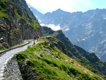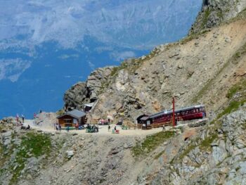 Le tramway du Mont-Blanc reste le plus haut chemin de fer de France – les rampes les plus fortes atteignent 25%. Il grimpe jusqu’à 2 372 m d’altitude et vous promène jusqu’au pied du Mont-Blanc le long de dénivelés qui peuvent atteindre 400m. Pendant le trajet -12 kilomètres- , six arrêts ponctuent le cheminement, une succession de paysages défilent. Il y a beaucoup de monde à bord du train, en plein été, des gens restent souvent debout et s’accrochent à une barre… le tramway a un peu les allures du métro parisien. En moyenne 11 000 personnes empruntent le petit train qui a été largement dans le film Malabar Princess de Gilles Legrand, (2004) avec Jacques Villeret.