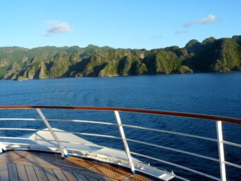 Après une nuit de navigation, au petit matin le paquebot approche de la petite ville trépidante de Coron. Elle mérite vraiment d’être explorée. Si les Philippines comptent quelque 7 000 îles toutes plus spectaculaires les unes que les autres, Coron et son île du même nom se démarque par son caractère sauvage et ses paysages… Alanguie au coeur de la province de Palawan, l’île fait partie du microscopique archipel des Calamian. Il faut la rallier en bangka, bateau traditionnel philippin, depuis l’île de Busuanga. Ce territoire ancestral des Tagbanua -peuple de pêcheurs et de chasseurs de nids d’oiseaux – est retranché derrière de hautes falaises calcaires. Il abrite des lagons, des lacs translucides et des fonds marins préservés. D’immenses parois karstiques noires emmitouflées de végétation se dressent telle une muraille infranchissable. Bordée de plages idylliques, Coron concrétise tous les rêves. En fin d’après-midi, de retour à bord, ceux qui ont encore de l’énergie se retrouvent dans la piscine pour la décontraction et pour une séance de farniente dans les bains bouillonnants. D’autres prennent place dans le salon panoramique située à l’avant du navire pour apprécier la navigation au plus près des côtes. Le soleil caresse les ponts puis… la lumière se fait discrète et disparaît lentement.