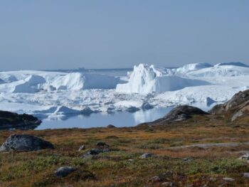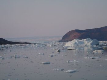 Là, près des maisons, règne une certaine agitation parmi les chiens groenlandais dont le pelage est bien clairsemé l’été. Grognements, aboiements puis hurlements suivent et se répandent progressivement à tous les chiens de la ville. Une bien drôle de cacophonie. Cette ambiance sonore typique des agglomérations groenlandaises est indissociable des souvenirs que l’on ramène d’un voyage dans ce pays. Soudain en marchant, un paysage de toute beauté s’offre à nous : au premier plan, un champ de linaigrettes ressemblant à un champ de coton, au second plan, une montagne de glace comme saupoudrée de neige. Et voici que l’on se retrouve devant le glacier Jakobshavn, le plus grand producteur de glace de tout l’hémisphère nord. Un spectacle étonnant et extraordinaire à la beauté presque irréelle. Les icebergs, sculptures de glace aux couleurs translucides poursuivent leur chemin éternel et semblent scintiller de mille feux. Ils sont immenses et nombreux, certains peuvent atteindre jusqu’à 100 m au dessus de l’eau. Ce glacier produit 6,25 milliards de mètres cubes d’icebergs par an, soit une quantité d’eau douce équivalente à la consommation annuelle française, et il avance de 20 mètres par jour ! Comment se lasser de cet endroit, un univers de glaciers et d’icebergs…