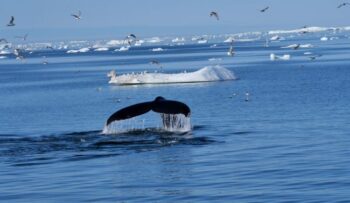 Le soir venu, l’Ocean Diamond quitte Ilulissat et la navigation entre des glaçons flottant à la surface de l’eau et étincelant comme des paillettes sous les rayons d’un soleil généreux est un vrai spectacle. On se croirait en pleine débâcle, comme si la banquise venait juste de se disloquer. Quelle splendeur ces nuances de blancs, de bleus et cette transparence bleutée de la glace sous les rayons du soleil… sans parler des reflets qui dansent sur les eaux sombres ! Et puis, on constate une multitude de formes d’icebergs : tabulaires, arrondis, fracturés, marbrés ou même formant une arche et des sculptures de glace. Soudain, un souffle au loin ! C’est une baleine à bosse qui se montre et nous l’accompagnons pendant un petit moment. Doucement, le navire quitte la baie de Disko et se dirige vers le glacier Equip un peu plus au nord.