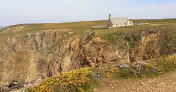 Si l’on continue la promenade, entre la pointe du Raz et sa petite jumelle du Van, on aperçoit la belle plage blonde de la baie des Trépassés. Nom assez lugubre qui fait allusion à une croyance druidique voulant qu’en ces lieux des passeurs embarquent les défunts vers les rivages de l’au-delà. Toutefois, la beauté sauvage du lieu attire à la belle saison de nombreux de surfeurs. La pointe du Van, éperon rocheux plus friable, est tapissé de bruyères et de genêts. Une modeste chapelle, dédiée à « monsieur saint They », reconstruite au 17e siècle au sommet d’un vertigineux à-pic de 70 mètres, tout au bord du gouffre, nous souhaite la bienvenue.