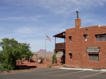 Le Goulding’s Lodge tire son nom de Harry Goulding et de son épouse Leone (surnommée Mike), venus s’installer en 1923, pour vivre et travailler avec le peuple Navajo. Ils gagnent la confiance des habitants et décident de créer un comptoir actuellement transformé en musée. Dans les années 30, Harry propose, aux producteurs d’Hollywood, que le site de Monument Valley devienne une annexe des studios californiens. John Ford fut convaincu et l’un des premiers “grands” westerns, “La chevauchée fantastique”, fut tourné sur les lieux en 1939 avec John Wayne. Le nom de l’acteur toujours associé aux paysages de Monument Valley (La charge héroïque, Fort Apache, etc…). Aujourd’hui, on trouve autour du comptoir, un musée, un “campground” ainsi qu’un lodge très bien équipé, au milieu d’un site exceptionnel, adossé à la montagne ocre. Des excursions guidées en véhicules 4X4 sont organisées par l’hôtel dans le gigantesque site de Monument Valley. Une adresse à privilégier pour séjourner à proximité de Monument Valley. Site web : www.gouldings.com
