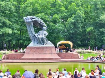 On ne peut pas visiter Varsovie sans évoquer le compositeur Frédéric Chopin car sa musique recèle à elle seule toute la quintessence de l’âme polonaise. S’il est né à Żelazowa Wola, le compositeur et pianiste a passé la première moitié de sa vie à Varsovie, qui lui rend hommage en divers lieux. Il existe une série de bancs multimédias, installés en 2010, à l’occasion des 200 ans de sa naissance. Le principe est simple : on appuie sur un bouton et on entend une musique de Chopin. Là où le compositeur est le plus célébré c’est autour de sa statue au sein du merveilleux parc Łazienki. C’est là, au pied de cette œuvre monumentale, qu’a lieu un concert Chopin, chaque dimanche de la mi-mai à la fin septembre, à 12 h et à 16 h (en face du portail, avenue Ujazdowskie). Ce parc est aussi très apprécié des Varsoviens, lieu de promenades au milieu d’une nature loin de l’agitation de la ville. Au cœur du parc se trouve la résidence d’été du dernier roi de Pologne – Stanisław August Poniatowski. C’est aujourd’hui un musée où l’on admire des tableaux des collections royales.